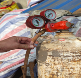 乙炔气瓶配置防回火装置,胶管用抱箍绑扎,更换有破口的胶管 |