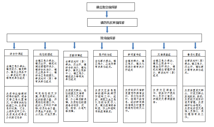 镇防指应依据洪涝灾害(险情)情况,成立现场指挥部,由镇长或分管副镇长任指挥长,由分管镇人武部、派出所、镇党政办、镇应急办、镇农业服务中心领导任副指挥长。现场指挥部根据需要设立工作小组,完成现场的综合协调、抢险救援、后勤保障、医疗救治、新闻宣传、灾情调查、善后处置等应急处置工作。工作组职责分工如下: