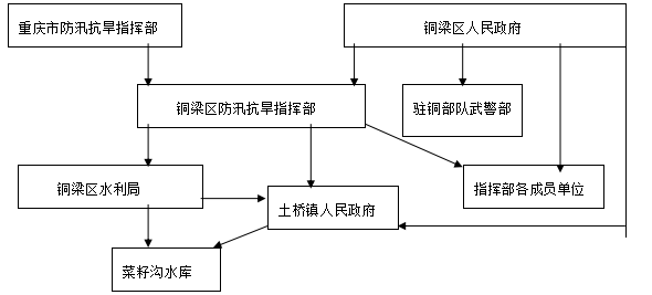 根据重庆市人民政府关于重庆市应急组织机构设置规划和现行的管理体制,结合《重庆市自然灾害处置办法》(渝府办第156号)规定的相关部门工作职责,按管理权限的层次,铜梁区菜子沟水库防洪应急处置组织机构的设置及职责依次为: