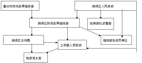 根据重庆市人民政府关于重庆市应急组织机构设置规划和现行的管理体制,结合《重庆市自然灾害处置办法》(渝府办第156号)规定的相关部门工作职责,按管理权限的层次,铜梁区杨家湾水库防洪应急处置组织机构的设置及职责依次为:
