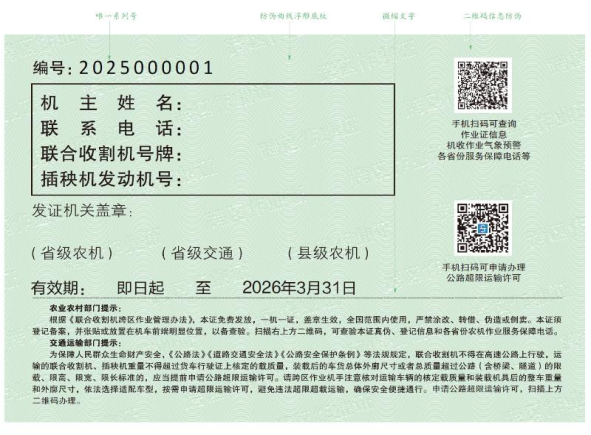 机手和有关管理部门可通过扫描作业证背面二维码,了解机收作业气象预警、各省级服务保障电话和公路超限运输许可申请办理等信息。
