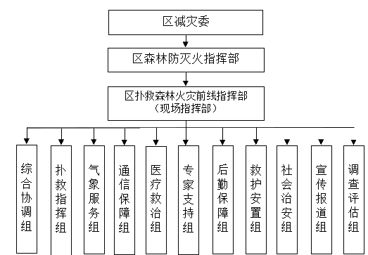 区减灾委下设区森林防灭火指挥部(以下简称区森防指),负责组织、协调和指导全区森林防灭火工作。