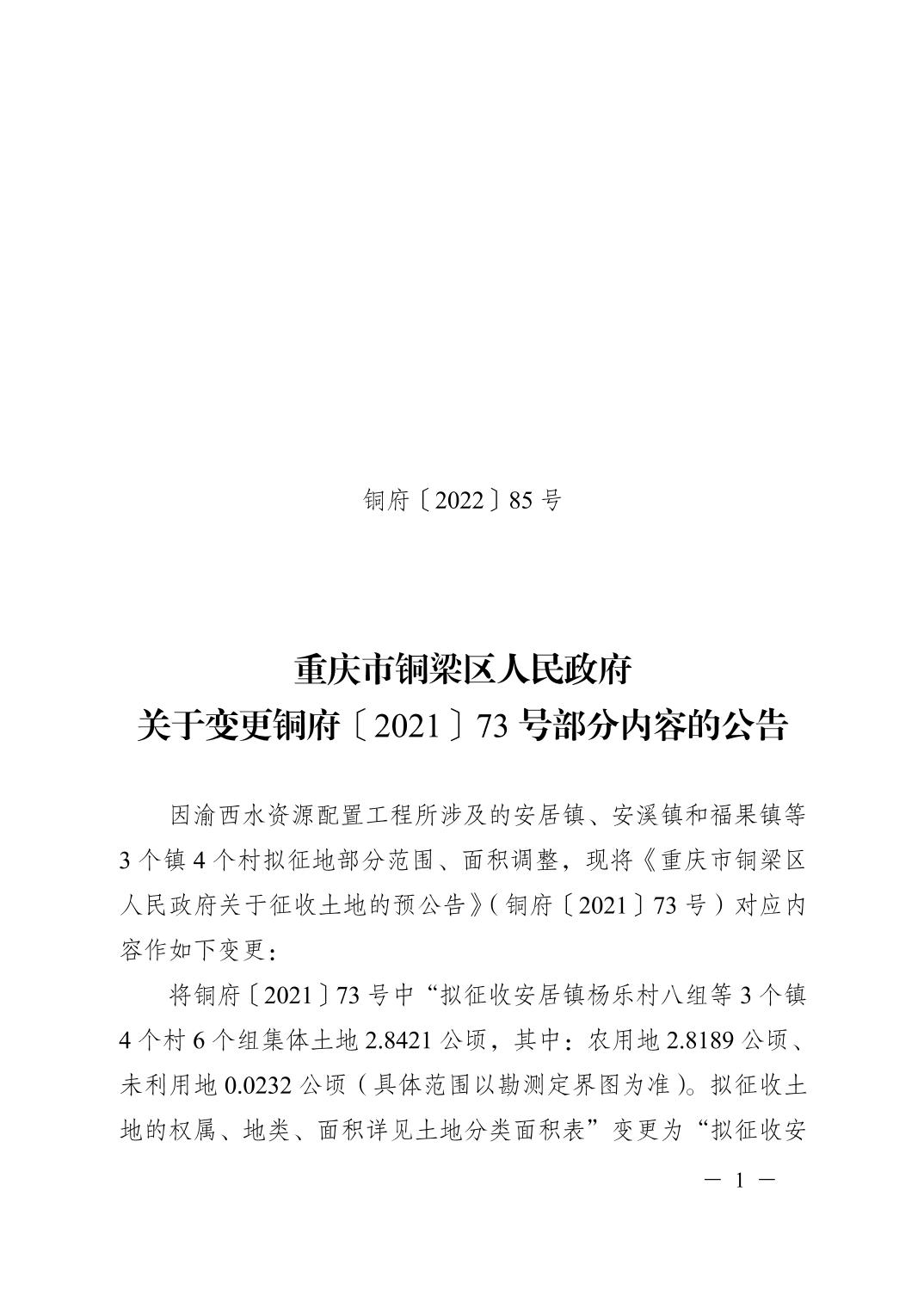 重庆市铜梁区人民政府关于变更铜府〔2021〕73号部分内容的公告