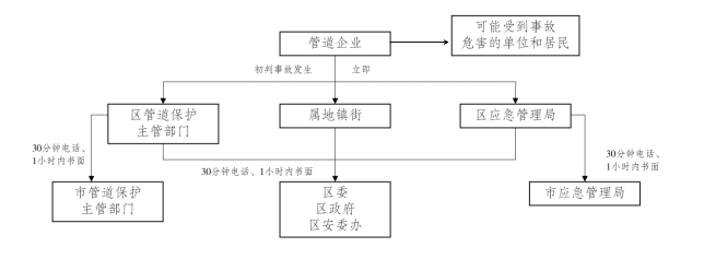油气长输管道事故发生后,事发管道企业应立即向区管道保护主管部门和区应急管理局报告,同时报告事发地镇街,并及时向可能受到事故危害的单位和居民通告。区管道保护主管部门、区应急管理局和事发地镇街应在30分钟内电话、1小时内书面向区委、区政府、区安委办报告。区管道保护主管部门、区应急管理局还应同时报告市管道保护主管部门、市应急管理局。