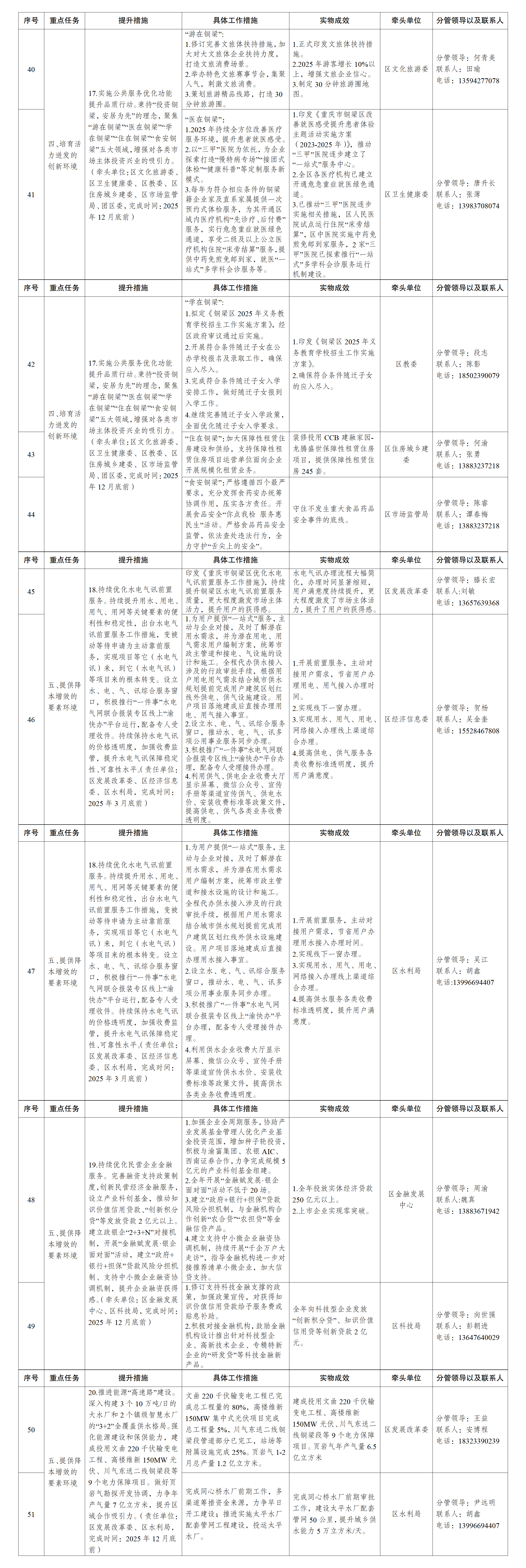 17.实施公共服务优化功能提升品质行动。秉持“投资铜梁,安居为先”的理念,聚焦“游在铜梁”“医在铜梁”“学在铜梁”“住在铜梁”“食安铜梁”五大领域,增强对各类市场主体投资兴业的吸引力。(责任单位:区文化旅游委、区卫生健康委、区教委、区住房城乡建委、区市场监管局,完成时间:2025年12月底前)