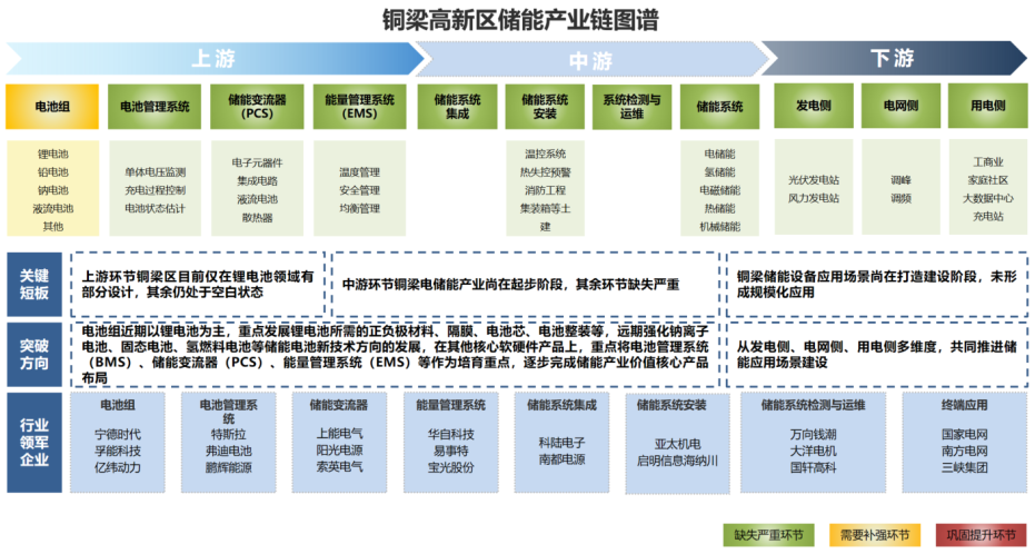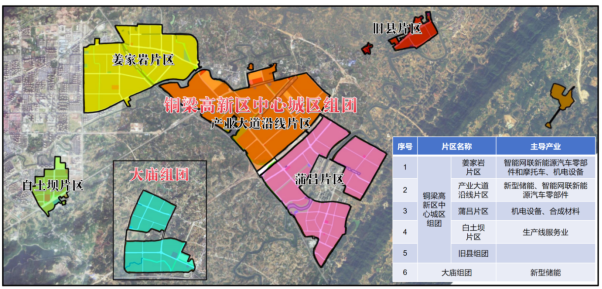 以铜梁高新区中心城区组团(含姜家岩片区、产业大道沿线片区、蒲吕片区、旧县片区、白土坝片区)作为产业核心区,以大庙组团作为新型储能产业集聚区,形成资源集聚、分工明确、优势互补的“两组团六片区”发展格局。其中姜家岩片区重点布局智能网联新能源汽车零部件和摩托车、机电设备等,产业大道沿线片区重点布局新型储能、智能网联新能源汽车零部件等,蒲吕片区重点布局机电设备、合成材料等,旧县片区重点布局[10]锂电材料等,白土坝片区重点布局生产线服务业。大庙组团重点布局新型储能产业。