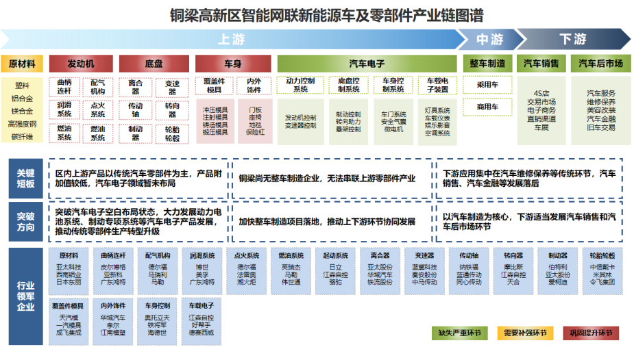 智能网联新能源汽车零部件——加快推动传统汽车配套企业向新能源汽车配套转型,加快在智能网联、汽车电子、汽车软件等高价值领域的引育布局,加强与两江新区、渝北区、璧山区、永川区整车企业协同,积极融入全市智能网联新能源车供应体系。重点发展动力电池系统、电机、电控及电空调、电刹车、电助力“大小三电”、制动转向系统等关键零部件及基础原材料。