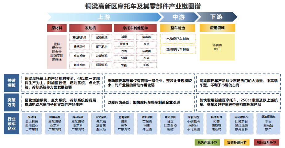 摩托车——加快推动摩托车整车及零部件产业围绕电动化、智能化、高端化提档升级,充分放大产业先发优势,逐步形成集研发设计、核心零部件制造、整车组装为一体的全产业链基地。重点围绕新能源摩托车、250cc以上大排量摩托车、高性能赛车及越野摩托车等产品品类,加快引进电气化摩托车零部件领域重点企业。