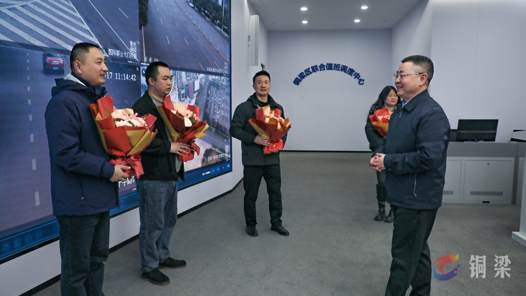 在铜梁区数字化城市运行和治理中心,指挥大厅大屏实时展示城市运行数据、交通流量、环境质量等各项指标,城市态势一目了然。皮涛向中心的工作人员送上新春祝福,感谢大家为保障城市安全有序运转、群众平安欢乐过节所付出的辛勤努力。
